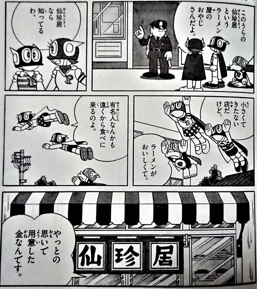 また、藤子・F・不二雄先生の『パーマン』には、「山珍居」のパロディが出てきます。『パーマン』の「ひったくり犯人にワナをかけろ」という話に「仙珍居」というラーメン屋が出てくるのです。